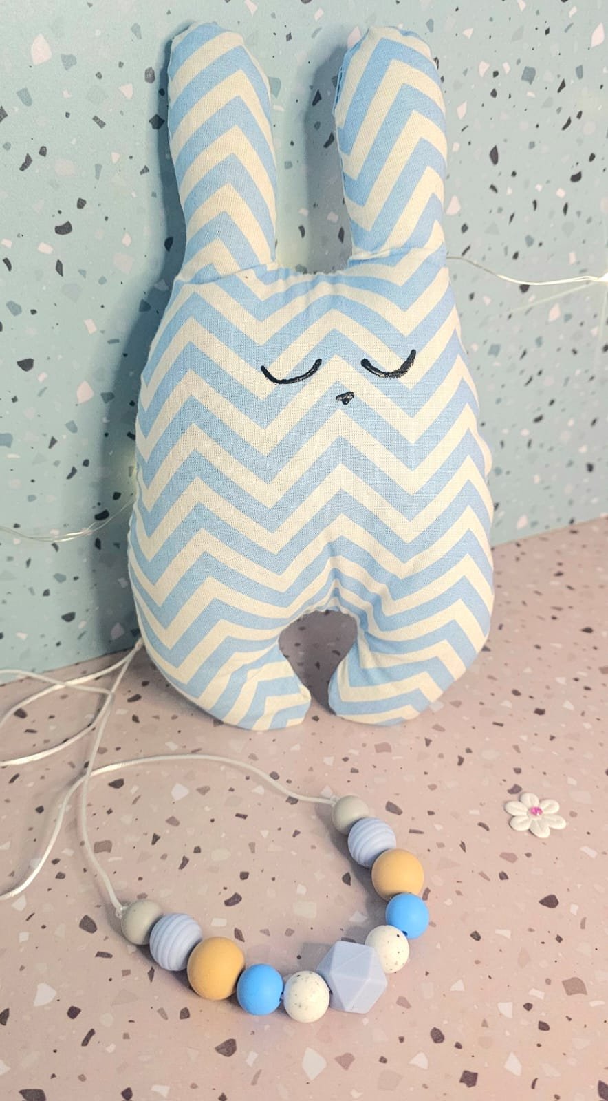Osito Doudous de Apego para bebé realizado en tela 100% algodón estampado y Collar de lactancia con cuentas de Silicona libre de BPA con broche de madera.