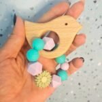 Mordillo para bebé con cuentas de silicona libres de BPA y  pajarito de madera natural que ofrece alivio en las encÃas por su forma redondeada. La madera es antiinflamatoria.